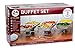 Buffet set: kit includes: 6 pans, 3 water pans, 3 wire racks, 3 serving spoons, 3 serving forks, 3 fuel cans. Everything you need for 3 complete sets! All items cam be disposed or reused.