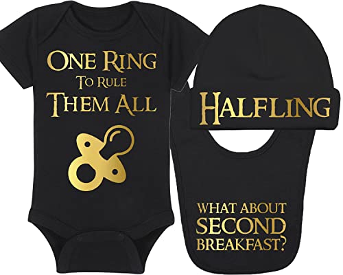 Fantasy Movie Baby Onesie, Hat and Bib - One Ring To Rule Them All - Halfling - What About Second Breakfast (12-18 Month - Black Fabric - Gold Design)