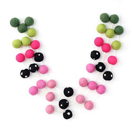 "Watermelon" Handmade Felt Ball Garland by Sheep Farm Felt- Green, Black & Pink Pom Pom Garland. 2.5 cm balls.