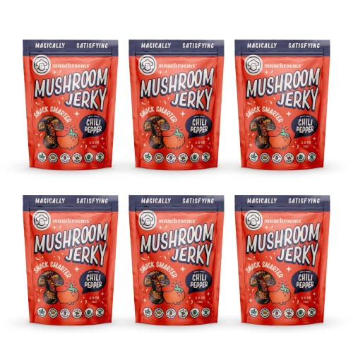 "Hot & Spicy Chili Pepper" half-dozen (100% plant-based vegan mushroom jerky) | Healthy Snacks | Plant Based Snacks | Vegan Snacks | Meatless Jerky | Shiitake Mushrooms | Non - GMO | 2.5 Oz (70g) (6 Pack)