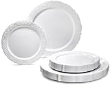 100 Piece Plastic Party Plates White with Silver Lace Design 50 Premium Heavy Duty 10.25 Inch Dinner Plates and 50 Disposable 7.5 Inch Dessert Appetizer Elegant Fancy Heavy Duty Wedding Plates